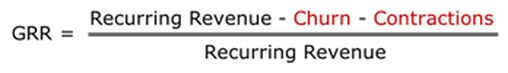 While net revenue retention focuses on the revenue retained from existing customers, gross revenue retention (GRR) measures revenue solely from customer retention. GRR calculates total revenue (excluding expansions and upsells) minus revenue churn (contract expirations, cancellations, or downgrades).